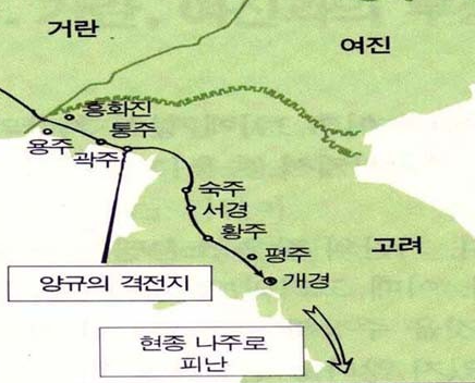 이렇게 고려를 침략한 거란 성종은 흥화진 전투에서 성을 점령하지 못하자 군을 2개로 나눠 한 부대는 흥화진을 포위하고, 나머지는 통주, 곽주를 거쳐 개경으로 진격합니다. 통주에서 강조의 30만군을 궤멸하지만 통주성은 점령하지 못하고 곽주성만은 점령하여 전진 기지로 삼습니다. 이후 개경으로 진격하여 함락시키죠. 현종은 나주까지 몽진을 떠나게 됩니다.